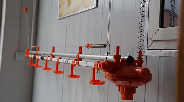 →飲水系統(tǒng)分為三個(gè)部分:供水系統(tǒng)、升降系統(tǒng)和防棲系統(tǒng)?! 」┧到y(tǒng)由減壓閥組件、水表組件、過(guò)濾器組件、加藥器組件、主水管道、分流器組件等組成?! p壓閥組件:對(duì)進(jìn)水壓力進(jìn)行調(diào)節(jié),使進(jìn)水壓力在0.03-0.4MPa; 水表組件:方便對(duì)每棟雞舍用水量進(jìn)行統(tǒng)計(jì),提供雞只清潔用手;同時(shí)對(duì)進(jìn)水壓力進(jìn)一步減壓; 加藥器組件:通過(guò)在加藥器上對(duì)加藥比例的調(diào)節(jié),給水管內(nèi)加入藥物,提高雞只免疫力; 升降系統(tǒng)的主要
